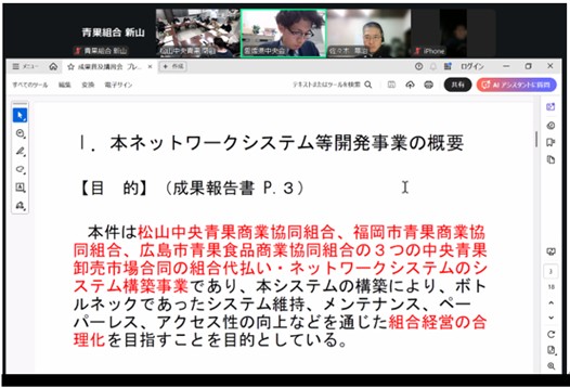 松山中央青果商業協同組合、福岡市青果商業協同組合、広島市青果食品商業協同組合の3組合合同で組合経営の合理化を目指し、組合代払い・ネットワ-クシステム構築事業を進めており、このたびオンライン講習会を開催しました。本事業は、組合代払い機能が青果商組合の根幹を成すものであることから、各組合が基本的な機能を共同利用、独自のカスタマイズや後からの参加も可能、クラウドで運営し災害時にはBCPにも寄与、共同利用による「割り勘効果」で維持費軽減等のメリットを享受するものであり、各組合のネットワ-クにより連携を図ることにしています。